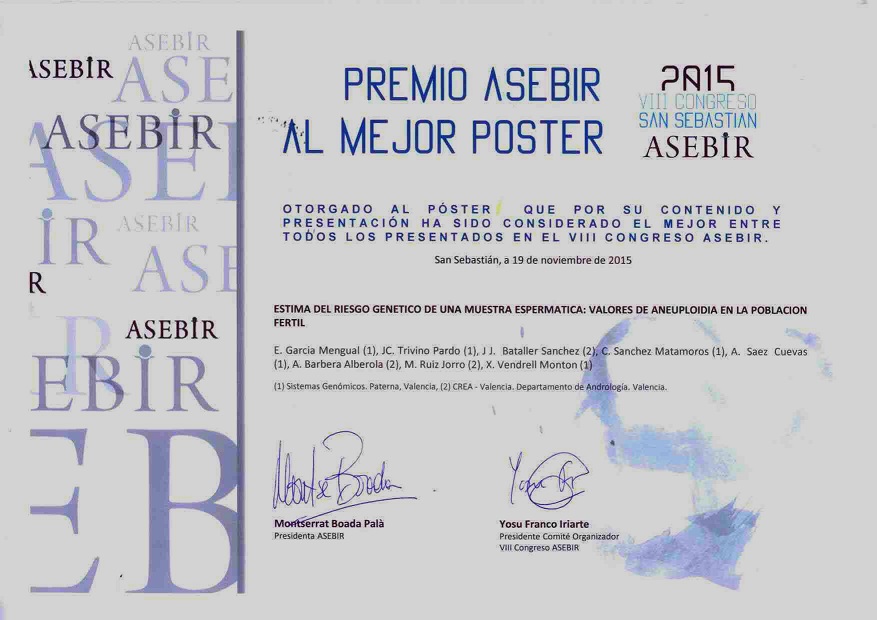Il lavoro di ricerca di CREA realizzato insieme all’azienda valenciana di genetica, Sistemas Genómicos, é stato riconosciuto come il miglior poster presentato presso il Congresso biennale dell’Associazione per lo Studio della Biologia della Riproduzione (ASEBIR) che é stato celebrato a San Sebastián tra il 18 ed il 20 Novembre 2015.